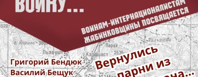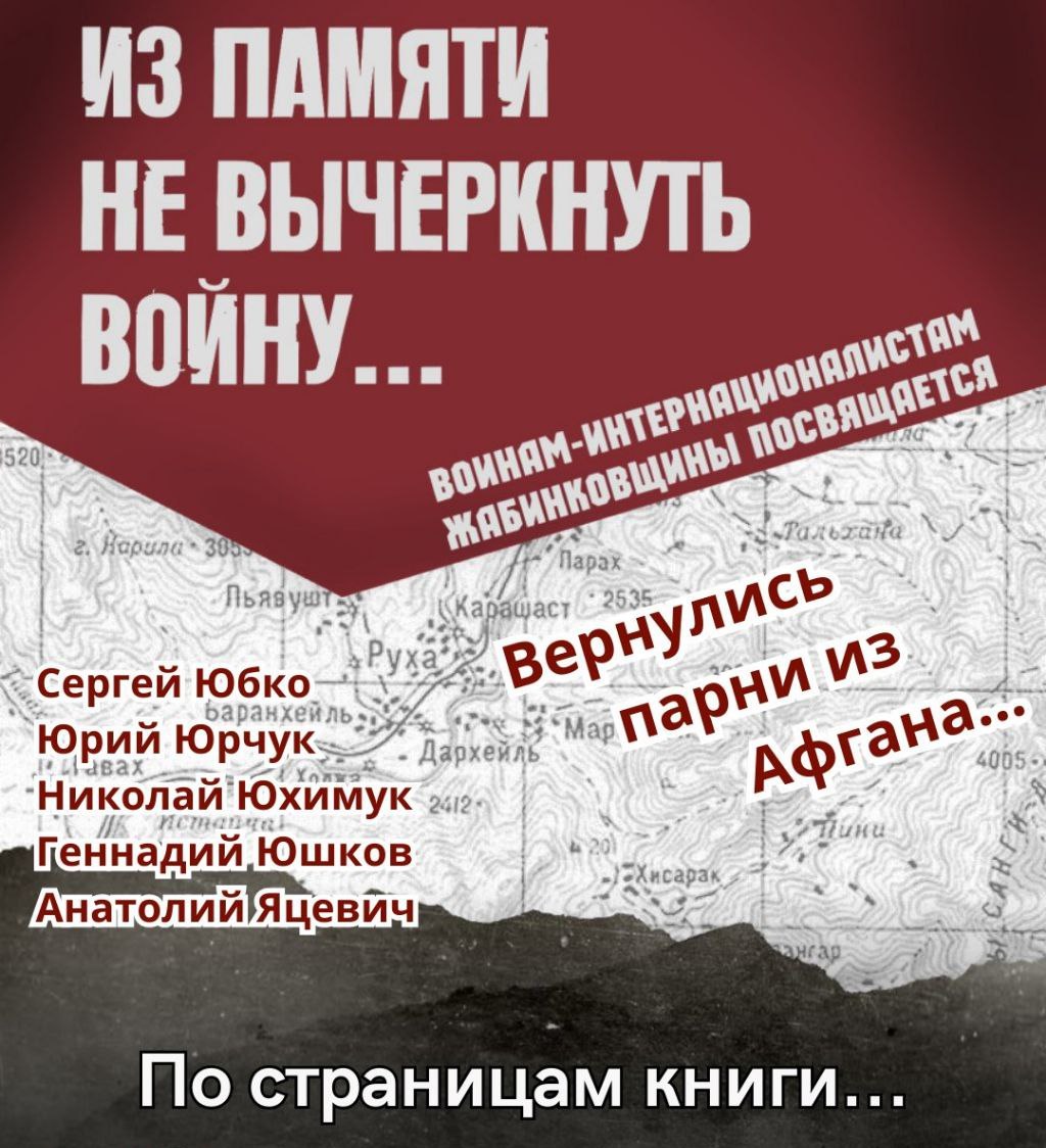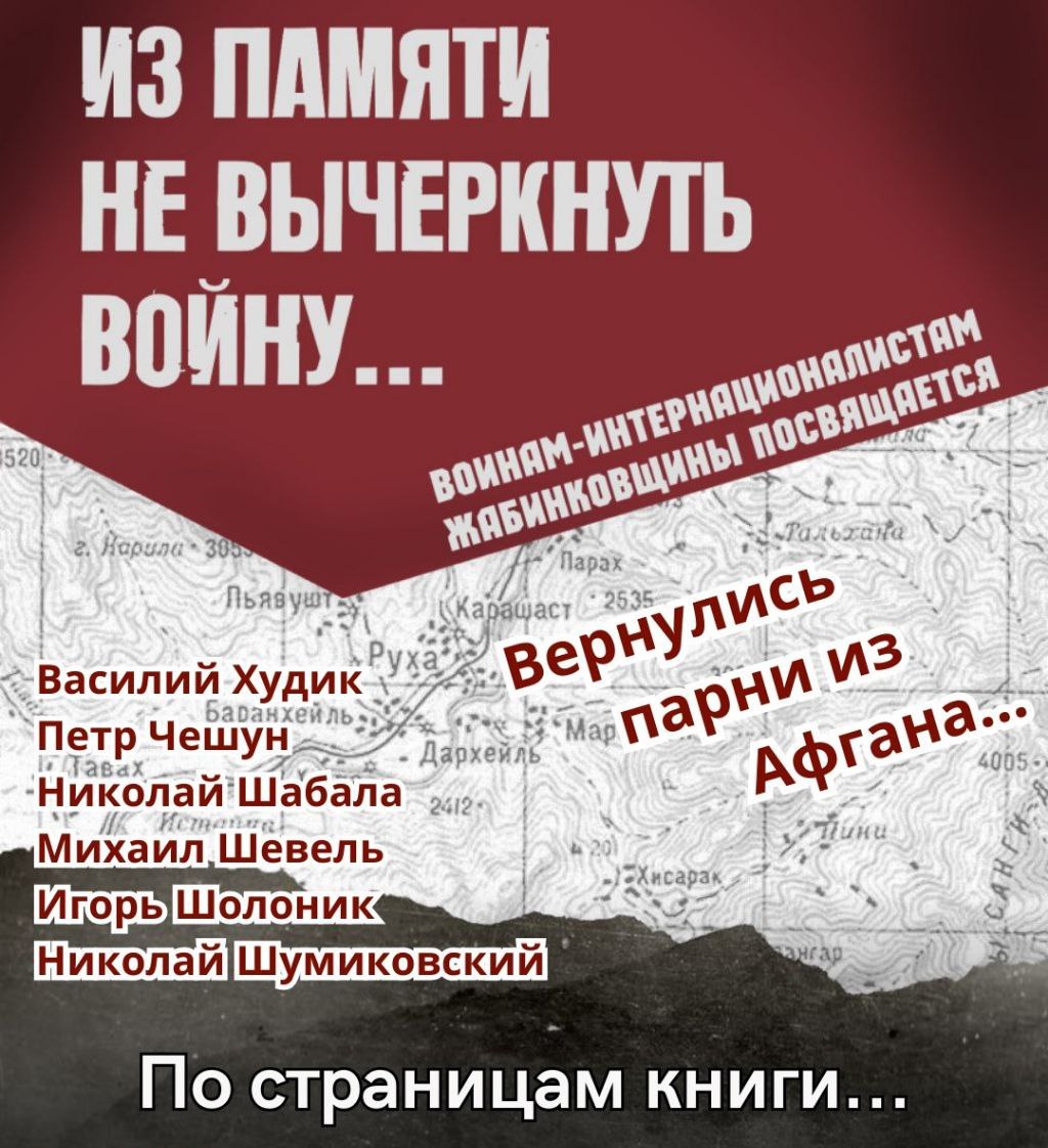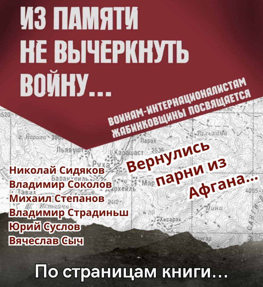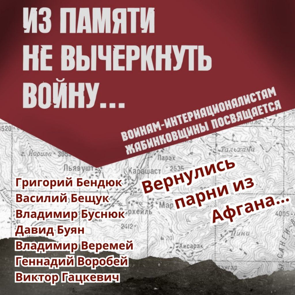 В 2024 году в городском Доме культуры состоялась презентация книги «Из памяти не вычеркнуть войну…: воинам-интернационалистам Жабинковщины посвящается», подготовленной сотрудниками центральной районной библиотеки. Каждый день мы будем публиковать имена и воспоминания воинов-интернационалистов Жабинковщины, которые прошли испытание огнем в Афганистане.