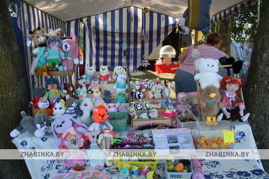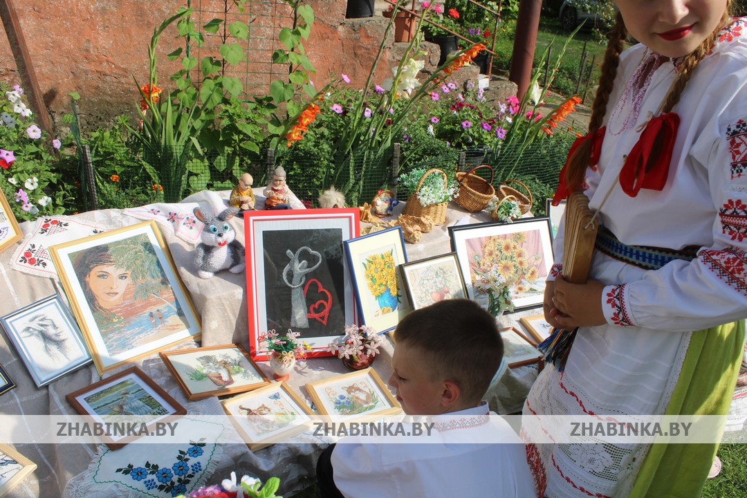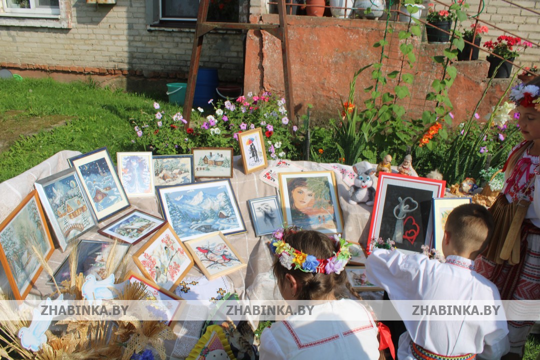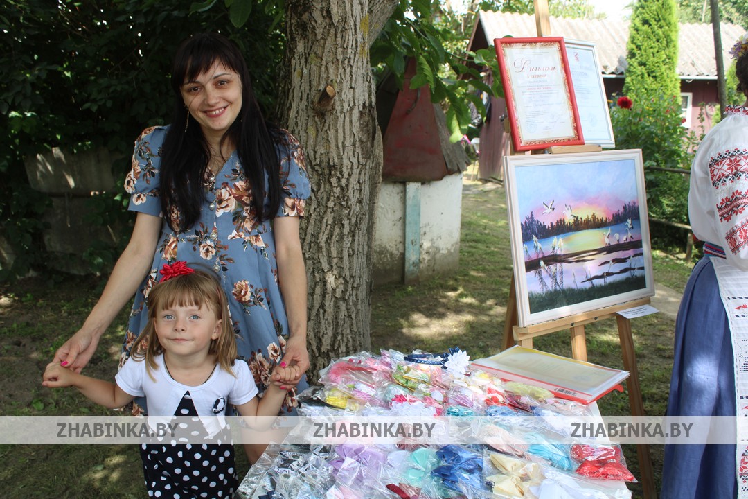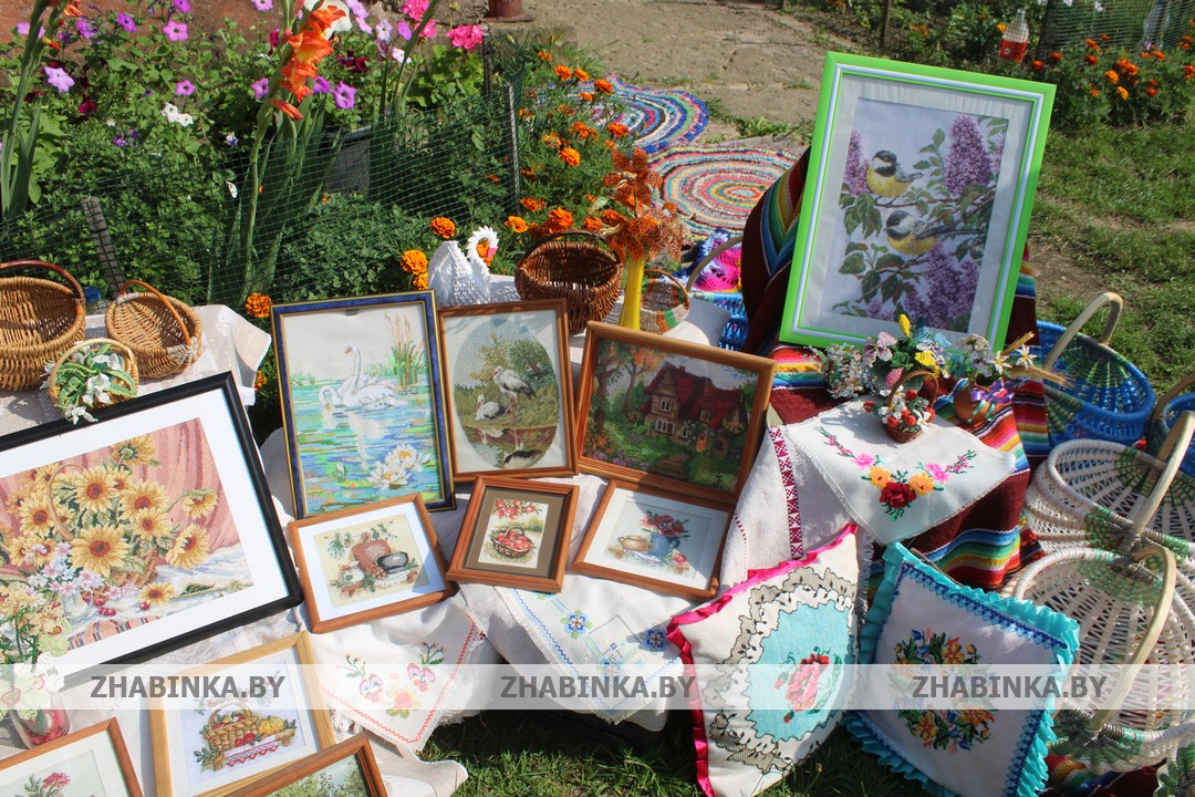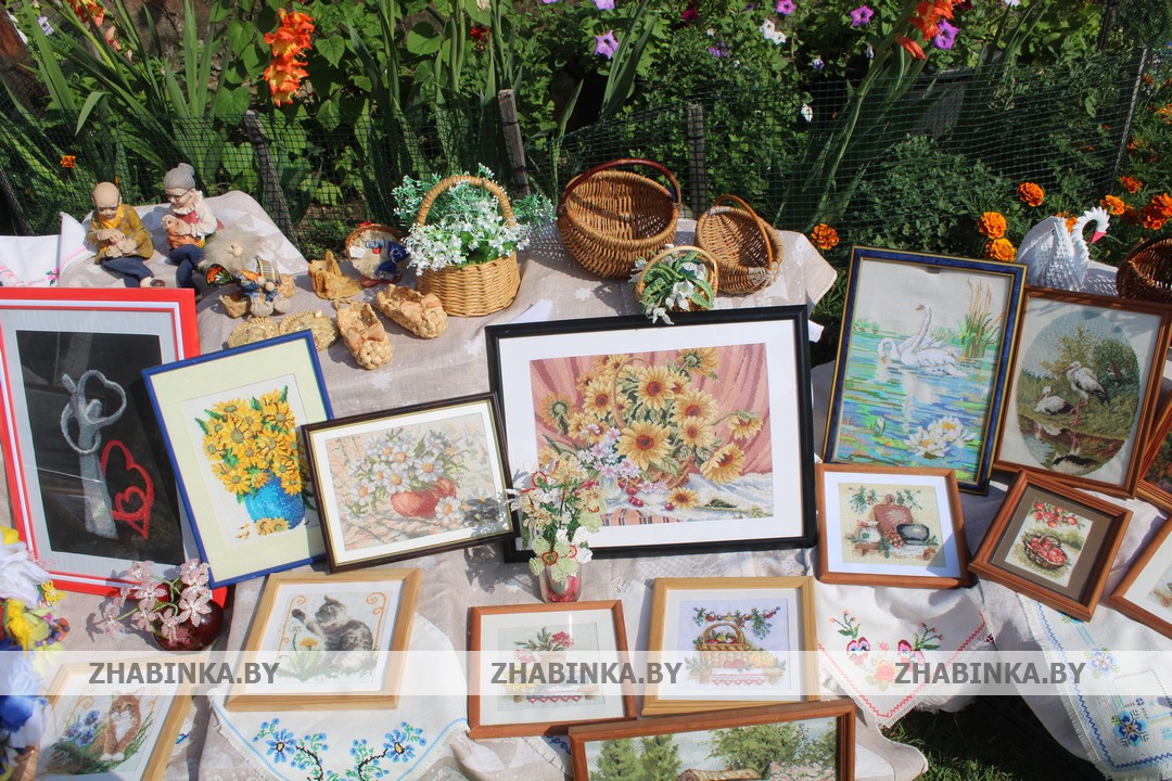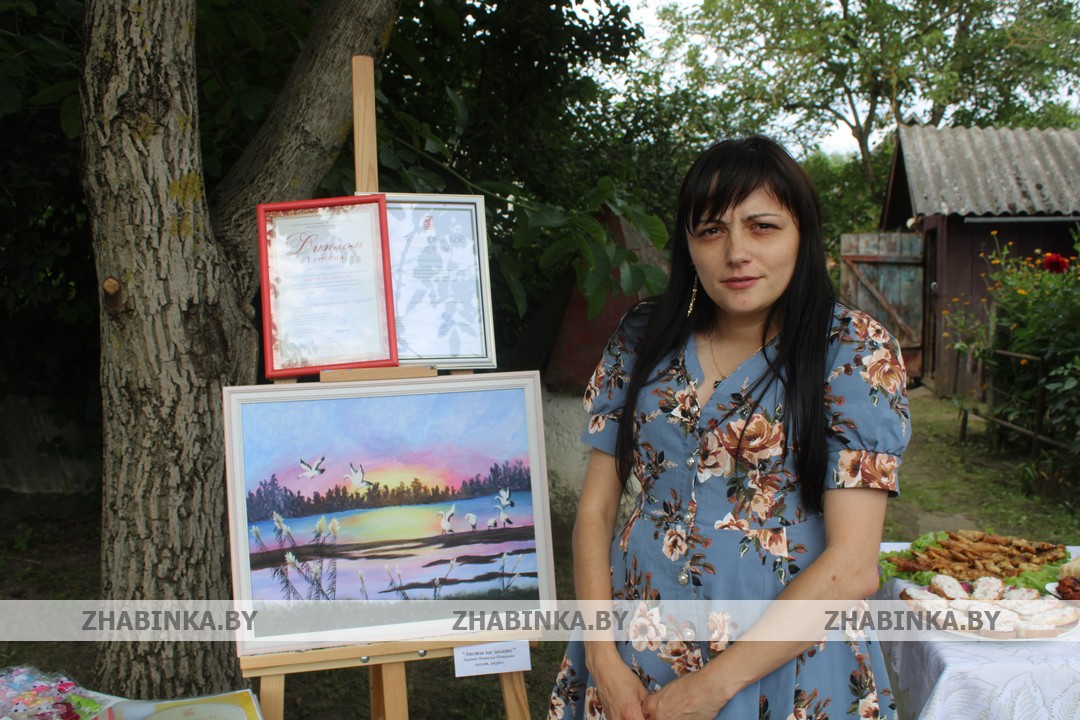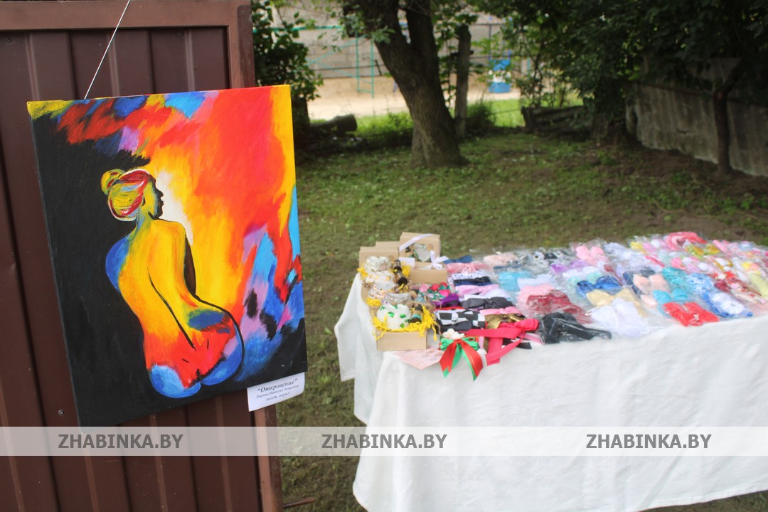 На падворку Раісы Дзмітрук разгарнула выставу карцін і вырабаў ручной работы яе дачка Наталля. З 2023 года яна афіцыйна займаецца рамесніцкай дзейнасцю: стварае заколкі-ўпрыгажэнні для валасоў, брошкі, аромакамяні, навагоднія вянкі, велікодныя сувеніры.