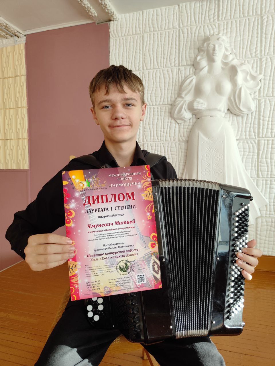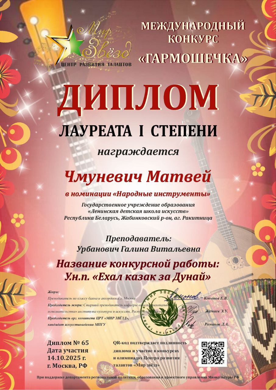 Поздравляем Матвея Чмуневича, учащегося ГУО «Ленинская детская школа искусств», с победой в международном конкурсе «Гармошечка»!