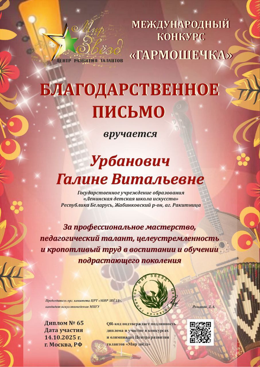 Особая благодарность — педагогу Галине Витальевне Урбанович, чья преданность делу и мастерство были отмечены благодарственным письмом.
