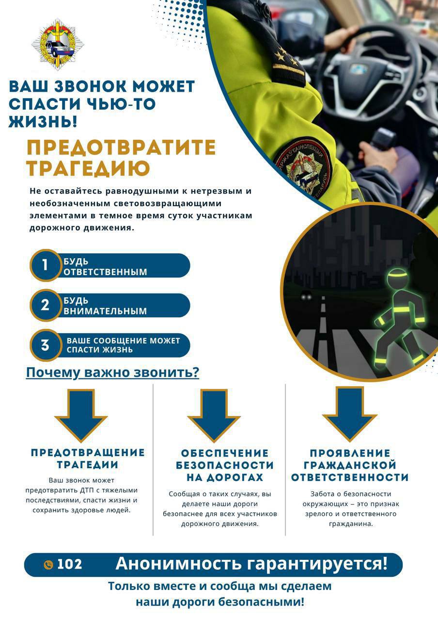 Уважаемые участники дорожного движения, если Вы заметили на дороге не обозначенного и (или) нетрезвого пешехода, велосипедиста или иного участника дорожного движения, угрожающего безопасности, сообщите незамедлительно по телелефону 102 или +37529 8235030! Ваш звонок может спасти чью то жизнь!