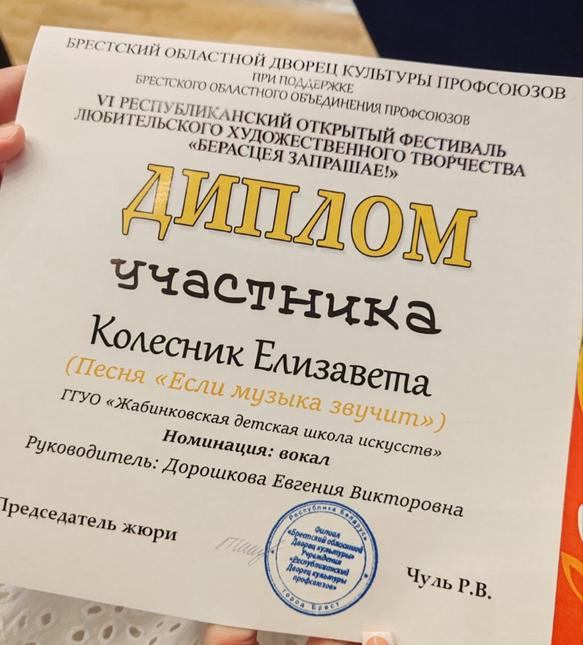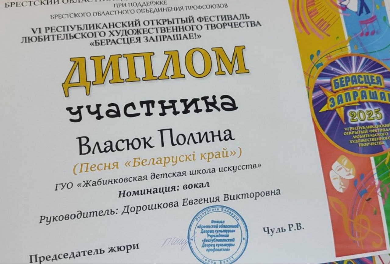 Поздравляем Полину Власюк и Елизавету Колесник с участием в VI Республиканском открытом фестивале любительского художественного творчества! Девочки выступили с вокальными номерами «Беларускі край» и «Калі гучыць музыка» и достойно представили Жабинковскую детскую школу искусств.