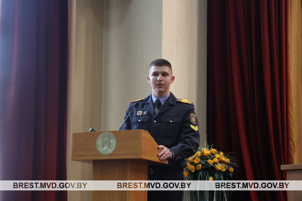Далее перед ребятами выступил командир 4 курса факультета криминальной милиции УО «Академия МВД Республики Беларусь» сержант милиции Никон Бут-Гусаим. Будущий офицер рассказал об особенностях и предъявляемых льготах при поступлении в ведомственный ВУЗ, а также буднях курсантов.