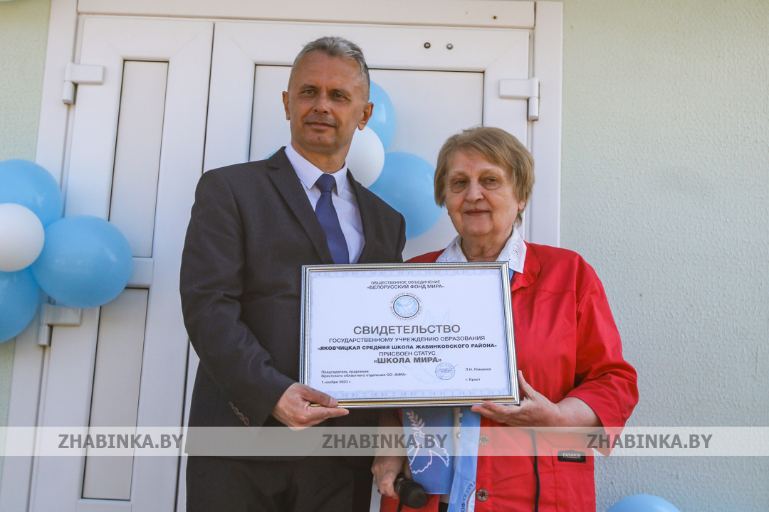 Она поздравила педагогов и учащихся Яковчицкой школы со знаменательным событием и вручила её директору Валерию Головейко свидетельство, подтверждающее статус «Школа мира». Кроме того, информационная доска с таким названием отныне будет украшать учреждение образования.