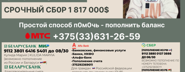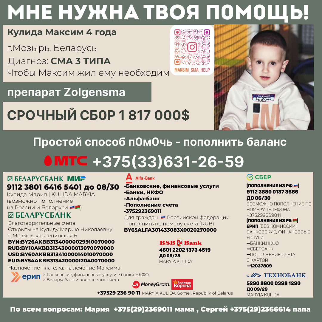 Остановить болезнь может препарат ZOLGENCMA, стоимость которого составляет 1 817 000 долларов США. Zolgensma подавляет синтез паталогического белка, тем самым сохраняет жизнь двигательных нейронов, что клинически проявляется остановкой заболевания. В Республике Беларусь уже закрыт не один сбора на препарат ZOLGENCMA. Благотворительные счета открыты в отделении ОАО «Беларусбанк» г. Мозырь (ул. Ленинская, д.6) на имя мамы — Кулида Мария Николаевна, УНП 100325912; БИК AKBBBY2X, BYN: BY26 AKBB 3134 0000 0299 1007 0000, USD: BY60 AKBB 3134 1000 0140 1007 0000, RUB: BY10 AKBB 3134 3000 0130 7007 0000, EUR: BY54 AKBB 3134 2000 0120 4007 0000 (IBAN) BY12 AKBB 3819 3821 0003 1000 0000 Назначение платежа: сбор средств на имя Кулиды Марии Николаевны (на лечение сына Кулиды Максима) Помочь Максиму можно пополнив баланс телефона МТС +375(33) 631 26 59 Услуга МТС «поделись балансом» *363*375336312659*сумма#вызов