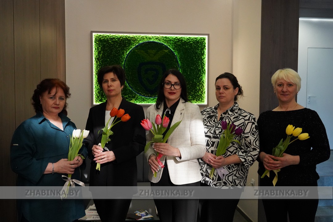От имени всех «сладких» женщин, работающих на сахарном заводе, своих коллег в Год белорусской женщины, в преддверии 8 Марта поздравляют начальник производственной лаборатории Татьяна Гинь, главный технолог Татьяна Шумиковская, заместитель генерального директора по идеологической работе и социальным вопросам Светлана Цюга, техник-нормировщик службы главного механика Ирина Гордеева и маляр-штукатур Нелла Гусева (на фото):