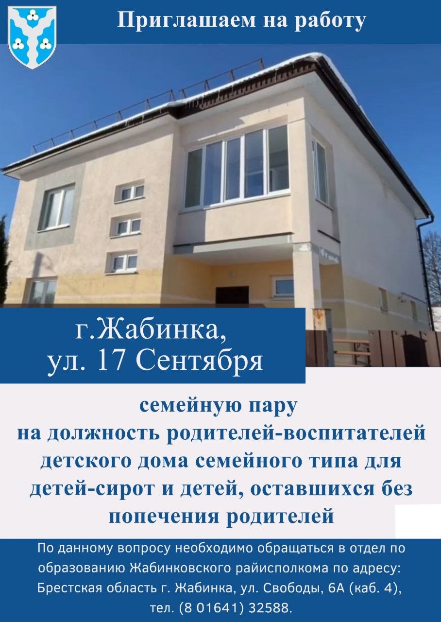 Отдел по образованию Жабинковского районного исполнительного комитета приглашает на работу семейную пару на должность родителей-воспитателей детского дома семейного типа для детей-сирот и детей, оставшихся без попечения родителей, расположенного по ул. 17 Сентября, г.Жабинки.