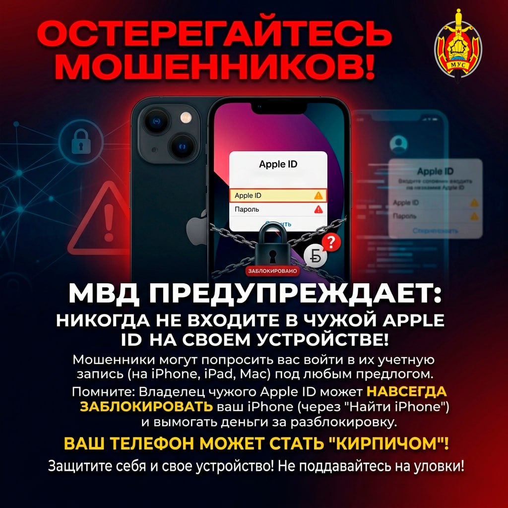 Мошенники в сети Интернет под разными предлогами могут просить выйти на вашем iPhone (iPad, Mac Book) из учетной записи Apple и войти в подконтрольную им. МВД ПРЕДУПРЕЖДАЕТ! Ни в коем случае НЕЛЬЗЯ ВХОДИТЬ НА СВОЕМ УСТРОЙСТВЕ В ЧУЖУЮ УЧЕТНУЮ ЗАПИСЬ! Ее владелец может НАВСЕГДА ЗАБЛОКИРОВАТЬ ваше устройство и в последующем вымогать денежные средства за разблокировку».